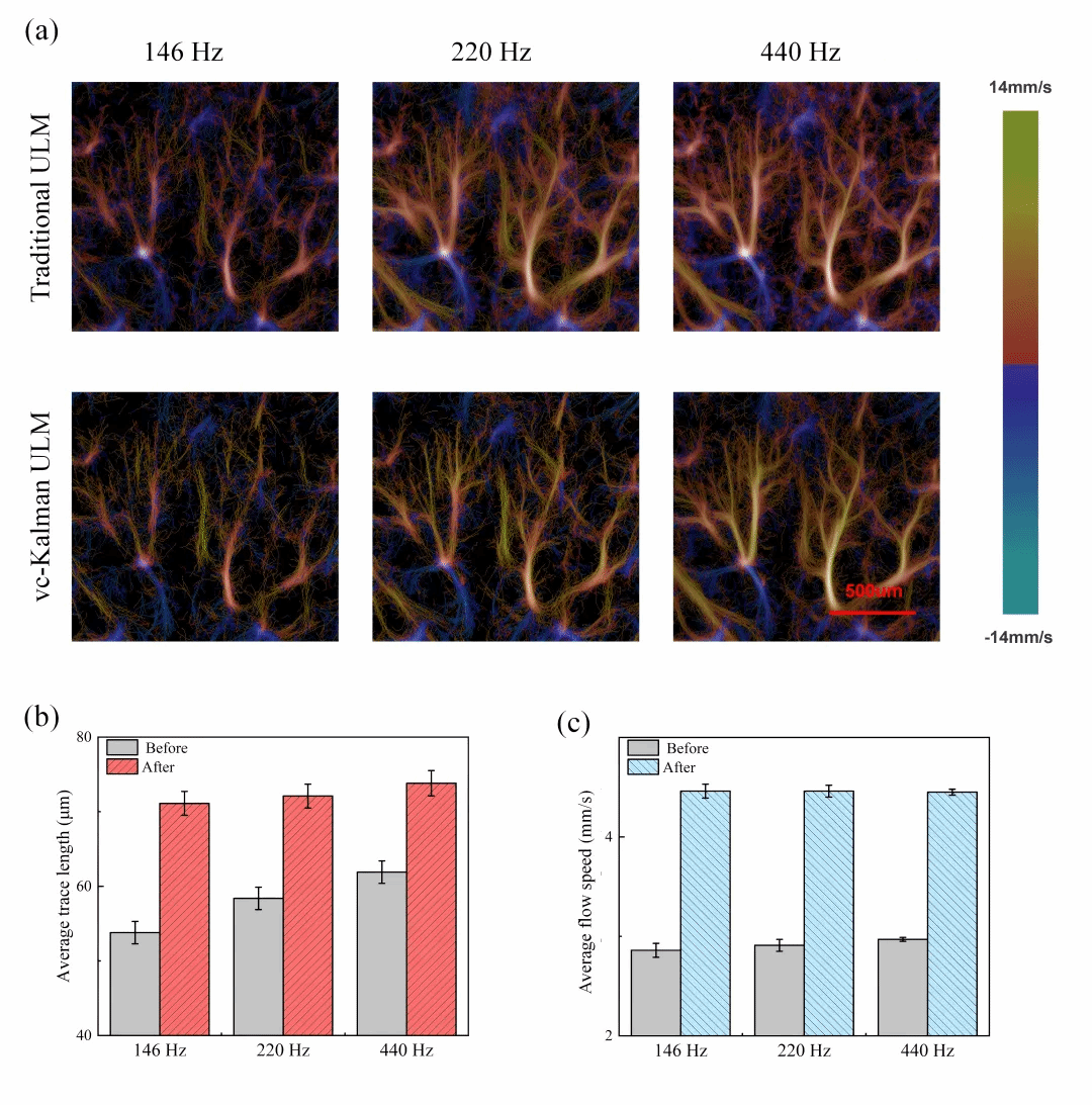 (3)低帧率条件下保持“稳、准、清”:本研究提出的vc-Kalman算法成功解决了传统ULM在低帧率成像时的轨迹匹配精度下降问题。通过融合微泡亮度特征与历史位置等多维信息,即使在146 Hz的帧率条件下也能实现可靠的微泡定位和微血流成像,这一突破将显著降低数据采集和传输要求,为便携式设备和术中实时成像铺平道路。图3展示了不同采样帧率下传统ULM方法与vc-Kalman ULM方法成像的结果对比,很明显vc-Kalman算法相较于传统算法具有更高的鲁棒性。